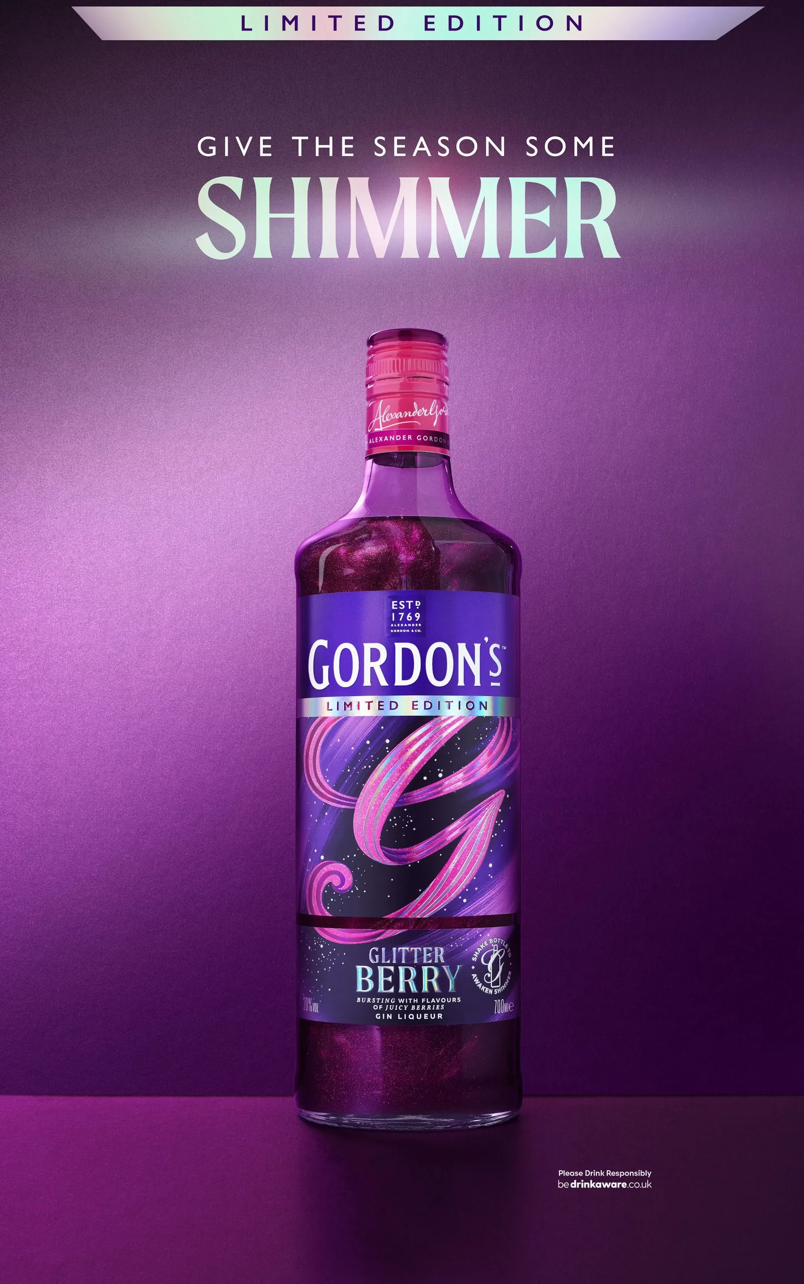 Gordon’s Shimmer Berry is a limited-edition, 20% ABV gin-based liqueur featuring a vibrant violet, shimmering appearance designed for festive occasions. It combines fruity notes of blackberry, cranberry, and strawberry with a subtle, edible glitter that activates when the bottle is shaken.